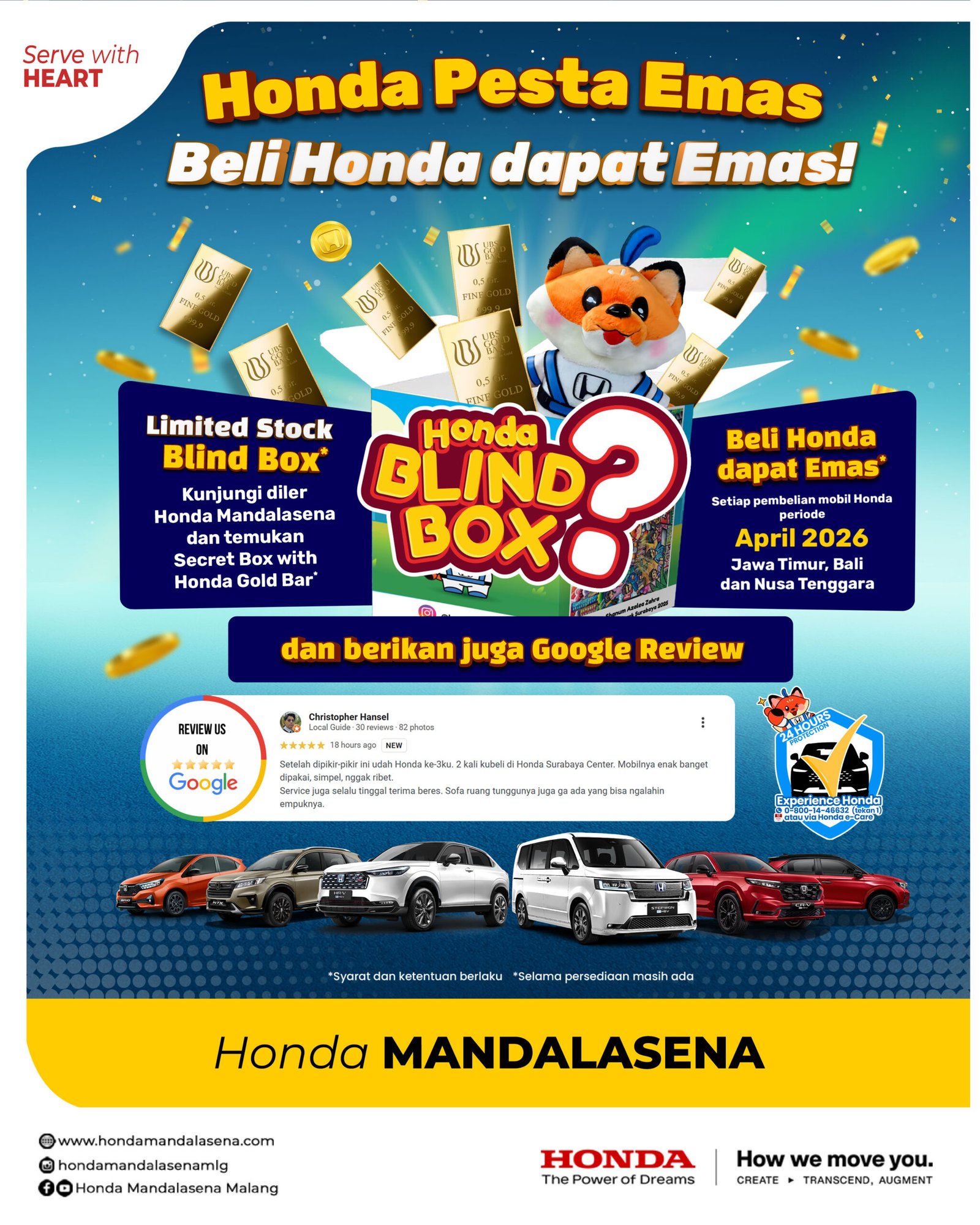 Honda Mandalasena adalah Dealer Resmi Mobil Honda peraih Penghargaan Terbaik di Malang Raya yang melayani pembelian baik secara tunai maupun kredit dengan uang muka dan cicilan yang ringan.