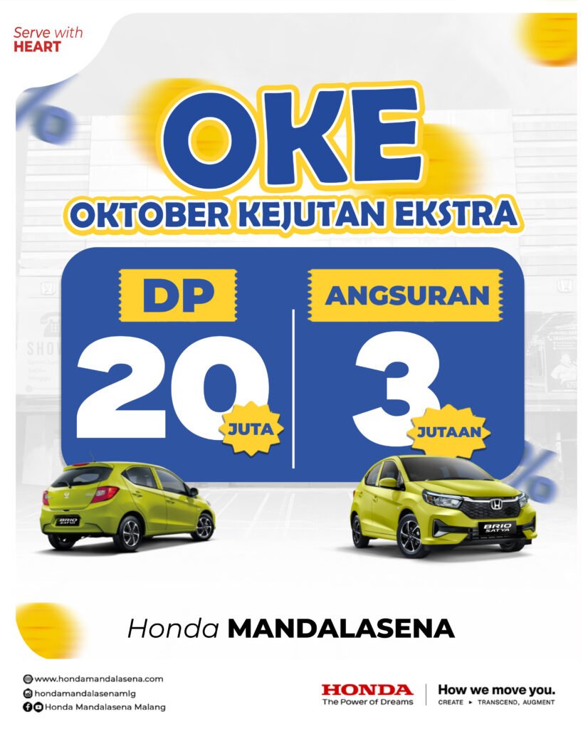 Di bulan istimewa ini, Honda MANDALASENA menghadirkan program promo paling heboh dan dinanti-nanti: OKE (Oktober Kejutan Ekstra). Program ini secara eksklusif kami persembahkan sebagai apresiasi bagi Anda, pelanggan setia kami, agar dapat memiliki mobil Honda Brio dengan penawaran yang sangat terjangkau.